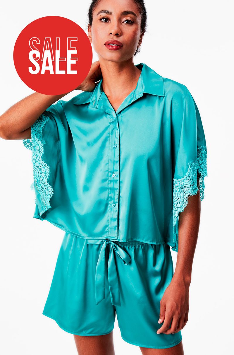 O Pijama Curto Cetim Mia mescla elegância e conforto com seu cetim sedoso e design contemporâneo. A blusa de manga ampla, com gola clássica e abotoamento frontal, ganha um charme extra graças à renda estreita com cílios na barra das mangas. O shorts curto completa o conjunto com um caimento fluido para noites aconchegantes.