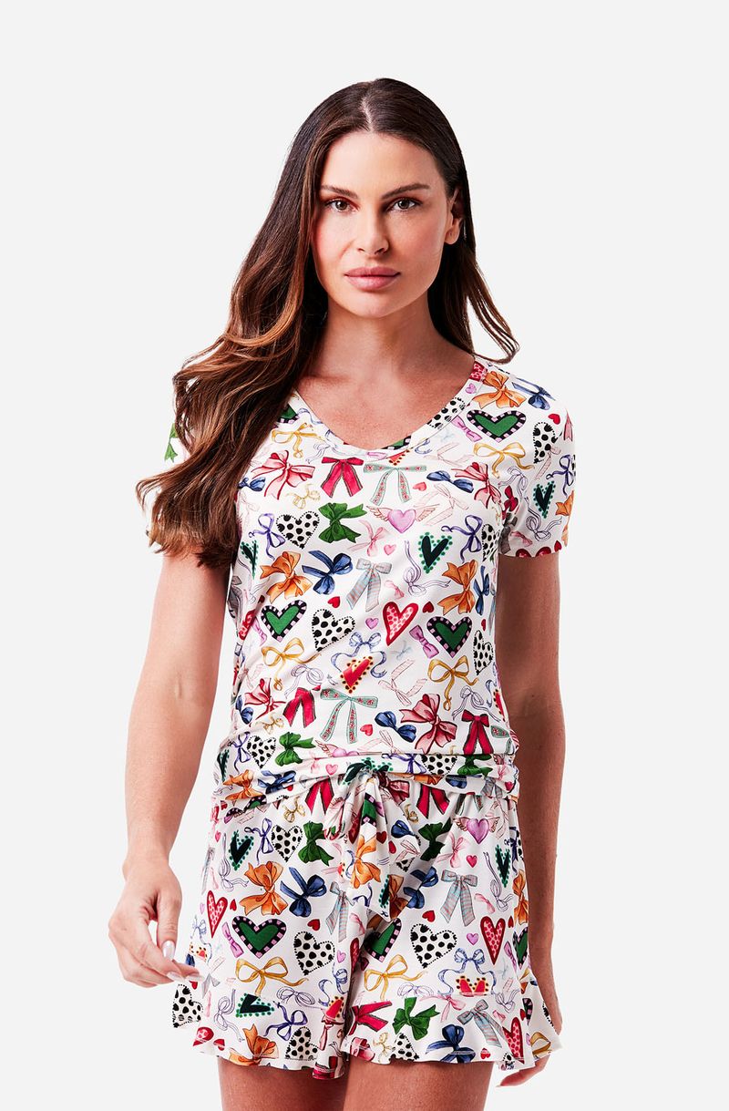 O Pijama Curto Manga Curta Amélie é a escolha perfeita para noites frescas e confortáveis. Confeccionado em malha macia, garante toque suave e caimento leve. Sua estampa exclusiva de laços e corações coloridos traz romantismo e charme, enquanto a blusa de manga curta e o short soltinho oferecem liberdade de movimentos com delicadeza.