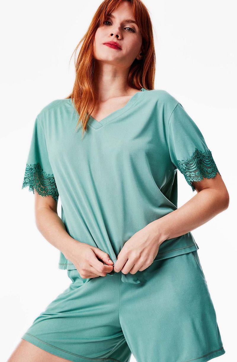 O Pijama Curto Malha Estocolmo une conforto e charme em um conjunto feito de malha suede verde macia. A camiseta de gola V tem modelagem soltinha e recebe um toque delicado de renda nas mangas. O shorts fluido é finalizado com um laço largo no cós, trazendo feminilidade ao visual de descanso.