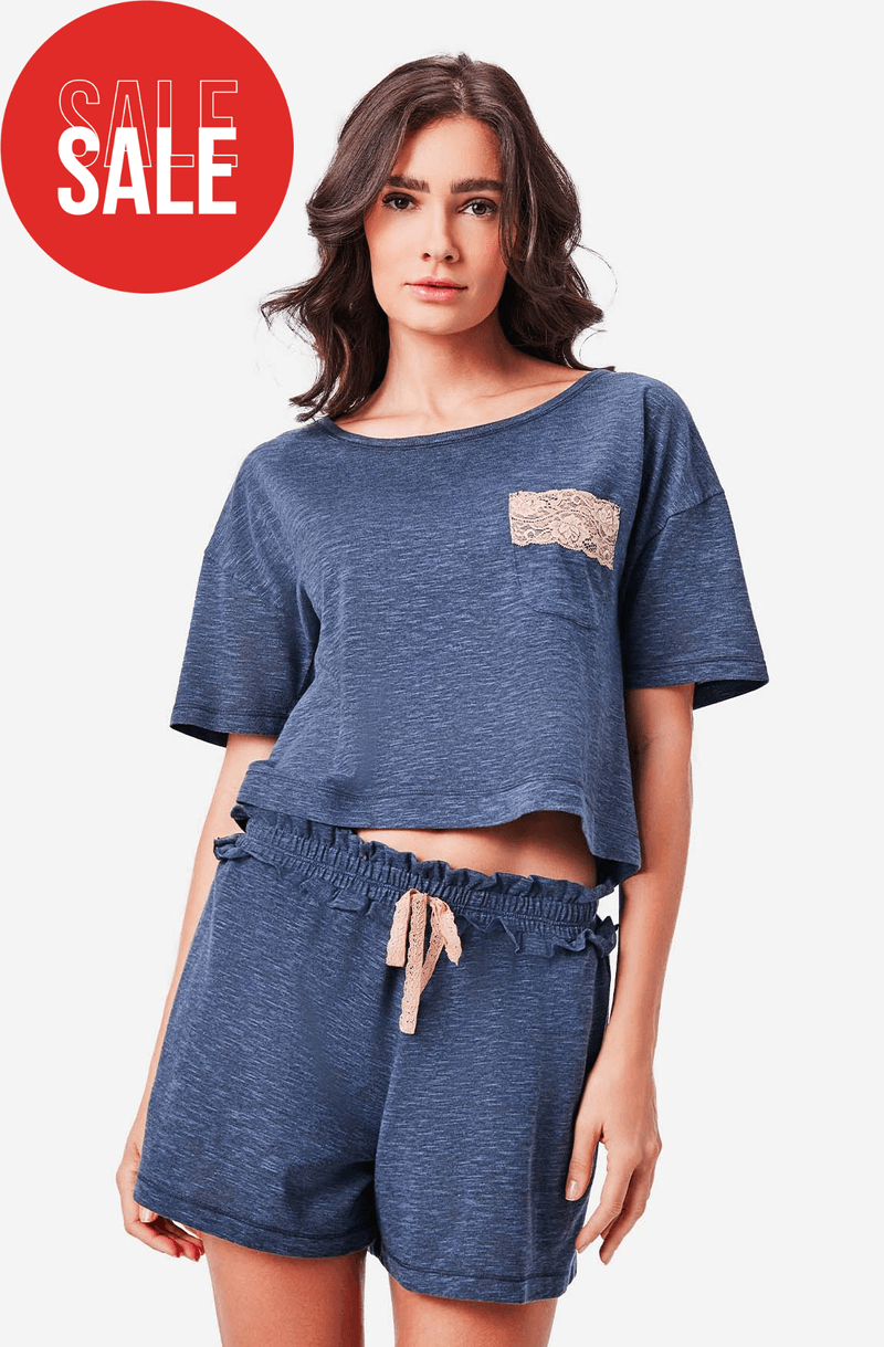 O Pijama Curto Malha Helsinque é perfeito para noites confortáveis e dias relaxantes. Feito em tecido flamê azul, conta com uma blusa de manga curta que traz um detalhe sofisticado com o bolsinho decorativo adornado com renda bege. O shorts acompanha a estética da parte superior, proporcionando um conjunto harmonioso.