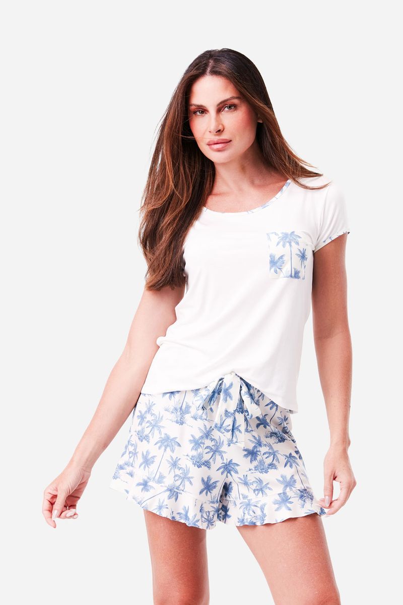 O Pijama Curto Malha Lyon traz blusa branca com detalhes da estampa tropical nos vivos e bolso, em malha suave que oferece frescor. O shorts soltinho possui cós elástico com laço, garantindo conforto e estilo para suas noites. Ideal para quem busca leveza e elegância em casa.
