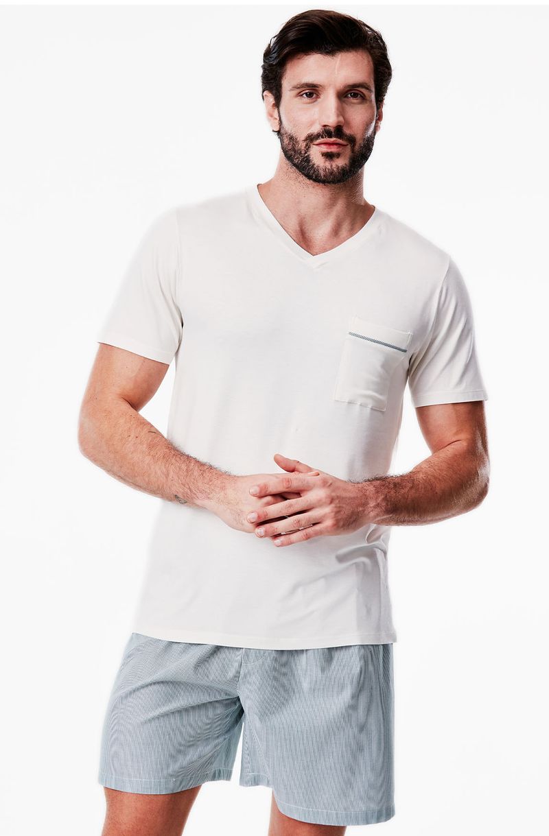 Perfeito para entrar no clima da coleção Islândia, o Pijama Curto Masculino veste com elegância e promove momentos em família ainda mais especiais. A camiseta off-white com gola V e bolso frontal harmoniza com o shorts em tricoline listrado verde e off-white, criando um visual leve e sofisticado.