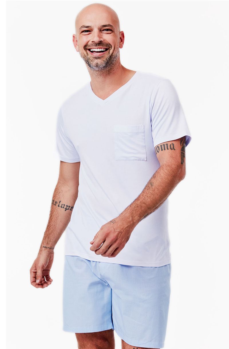 O Pijama Curto Tricoline Suécia Masculino eleva seu momento de descanso, aliando maciez, frescor e um toque de elegância. O conjunto traz uma camiseta de malha MVS off-white com gola V e bolso combinada a um shorts em tricoline listrado azul e branco.
