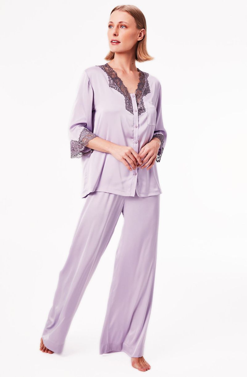 Com caimento impecável e toque acetinado, o Pijama Longo Frigg é totalmente confeccionado em cetim lilás. A blusa de mangas médias com abotoamento frontal ganha um toque de romantismo com a renda cinza escuro no decote. A calça acompanha o estilo fluido e confortável do cetim, criando um conjunto clássico e sofisticado.