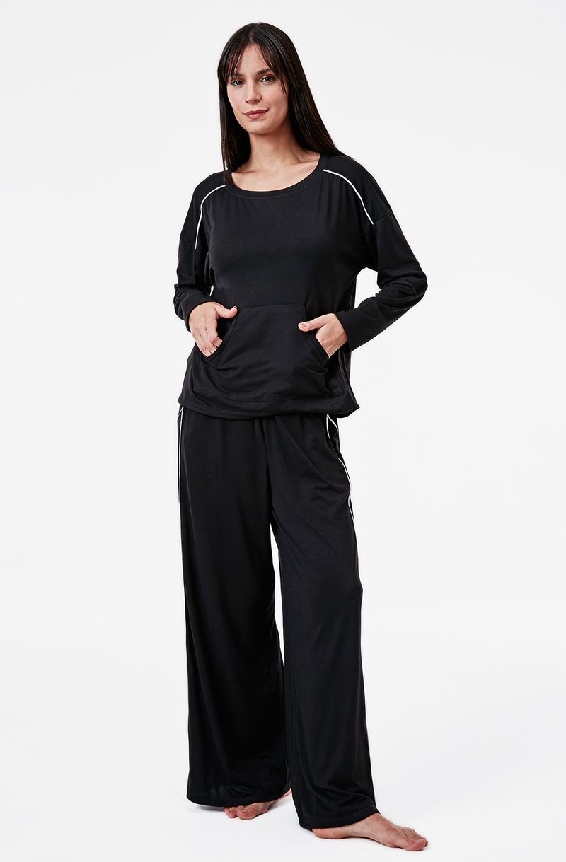 O Pijama Longo Malha Kari combina aconchego e estilo em uma proposta versátil. Confeccionado em malha preta ultra macia e quentinha, ele envolve o corpo com conforto absoluto. A blusa ampla de manga longa com bolso canguru funcional e a calça soltinha proporcionam liberdade de movimento e um visual despojado. O charme especial fica por conta dos vivos off-white, que contrastam elegantemente com o preto. O conjunto é uma escolha moderna e sofisticada, ideal para relaxar em casa, viajar com estilo ou criar um look casual chic.