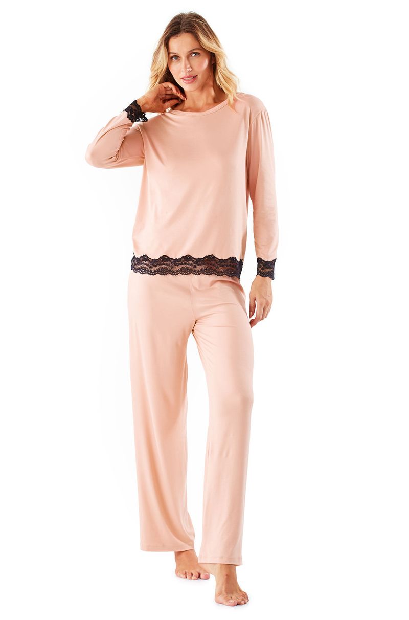 Pijama longo manga longa produzido em malha suede que possui um toque de pêssego, caimento perfeito e sensação aconchegante no corpo. A modelagem da blusa é soltinha e tem manga longa. A calça tem pernas retas e soltas com elástico na cintura para proporcionar mais conforto. O detalhe fica por conta da renda preta na barra das mangas e da blusa para criar um contraste bonito no conjunto.