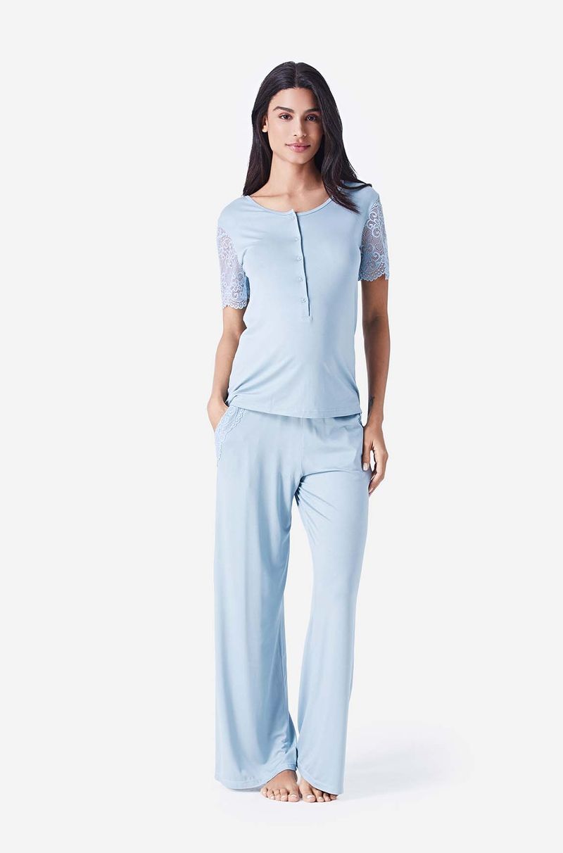 Em um irresistível tom de azul, a coleção Puerto Rico foi pensada para unir charme, elegância e conforto neste momento tão especial da vida de uma mulher. O Pijama Longo Malha Puerto Rico, feito em malha viscose com tecnologia MVS, resiste ao desgaste e previne a formação de bolinhas, preservando sua maciez e beleza por mais tempo. O destaque da peça fica por conta dos detalhes refinados em renda nas mangas e nos bolsos. Os botões frontais na blusa oferecem praticidade, sendo perfeito para as mamães que estão na fase de amamentação. A calça, com modelagem ampla e cós elástico, proporciona um ajuste ideal para máximo conforto.