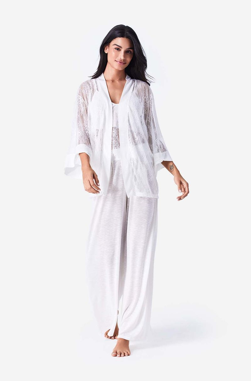 O Pijama Longo Trio Renda Almar combina frescor, conforto e praticidade em um visual clean. Composto por camiseta regata com leve transparencia, calça longa em malha freeze e kimono rendado , ele é confeccionado em malha Freeze 100% algodão, leve, macia e respirável. A modelagem soltinha proporciona liberdade de movimento e caimento lounge, ideal para noites de verão, look resortwear, home office ou momentos de relax em casa. O off white sofisticado e os detalhes minimalistas completam o look, tornando a peça elegante e presenteável.