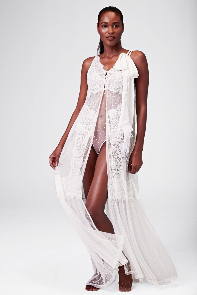 Pensada exclusivamente para o seu momento especial, a coleção St Barth é uma verdadeira expressão de elegância e feminilidade. O Robe Longo Renda St Barth possui design em estilo regata e modelagem reta que combina graciosamente o tule poá com a renda estática. O abotoamento de pérolas e o laço de cetim com plumas na alça são detalhes que valorizam a peça e adicionam um charme. Sinta-se única e deslumbrante com a sofisticação exclusiva deste robe!