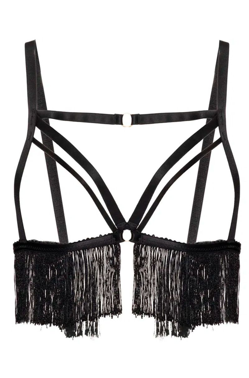 Sutiã confeccionado de franjas, elásticos. Com straps na frente, seios vazados e franjas, essa coleção traz muita sensualidade ideal para momentos especiais.