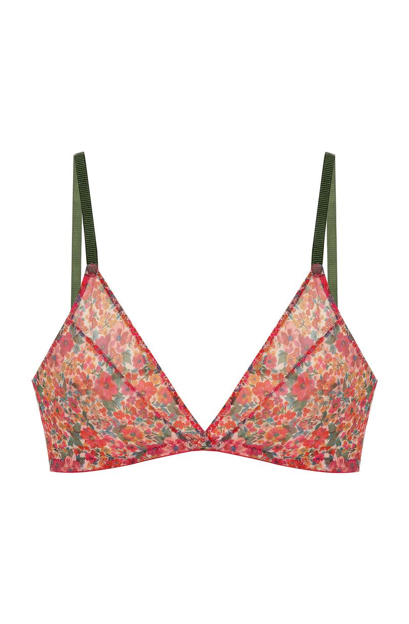 O Sutiã Top Triângulo Tule Mys une a leveza do tule estampado floral liberty à modelagem contemporânea, sem fecho nas costas para maior praticidade. Apresenta um decote sutil que valoriza a região do busto e alças texturizadas em verde escuro com argola e regulador para total ajuste ao corpo. Este top é ideal para quem busca conforto, visual delicado e um toque de modernidade no dia a dia.